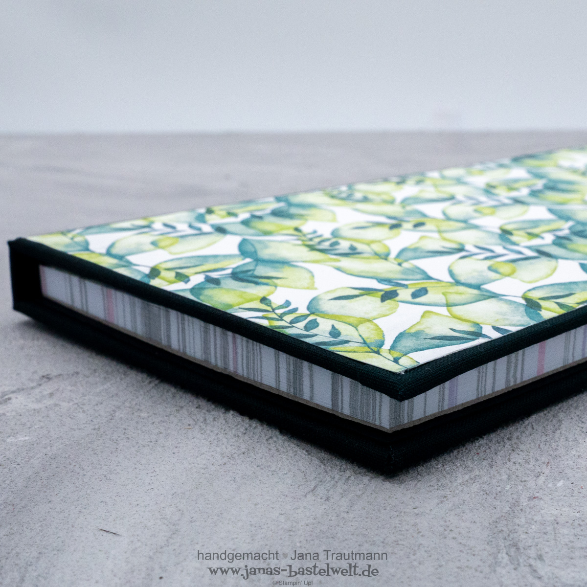 Da der Kalender und die damit benötigte Buchbinderpappe so breit ist, dass ich diese nicht mit einem Bogen Designerpapier beziehen konnte, habe ich die Ränder der Pappe mit Buchbinderleinen in Schwarz eingefasst und das Ganze mit dem Designerpapier verkleidet.