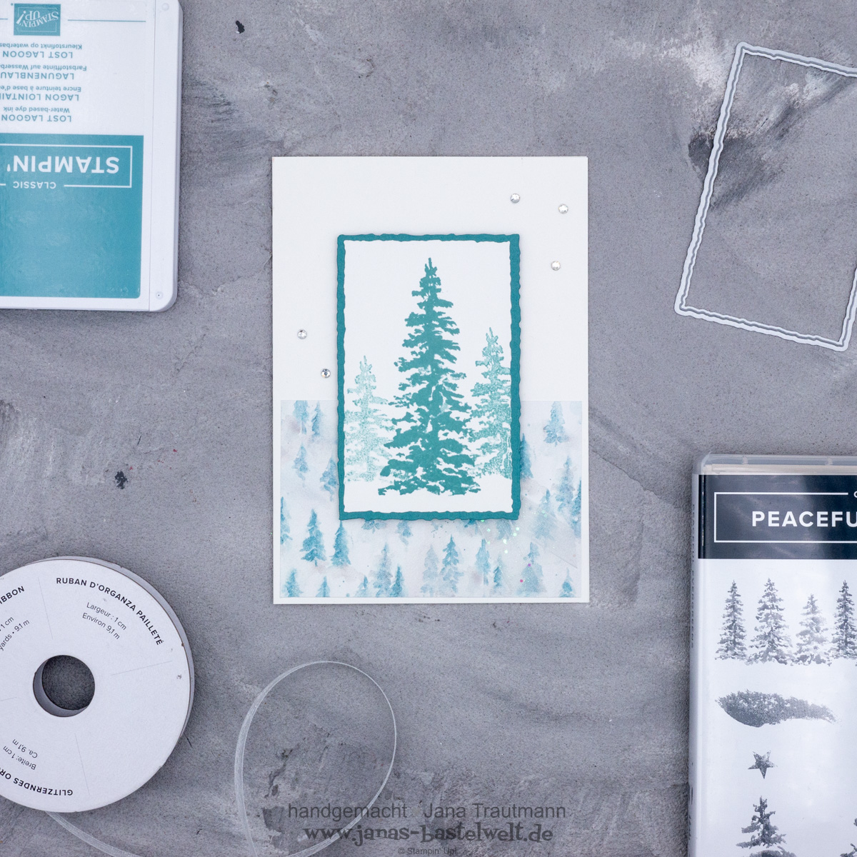 Zack ist schon wieder ein Monat rum und der nächste StampIRATION Blog Hop ist am Start. Dieses mal dreht sich alles um "winterliche Grüsse". Ich habe mir dafür das Stempelset "Peaceful Evergreens" geschnappt, da dieses endlich benutzt werden wollte. Entstanden ist eine eher zarte Karte in Lagunenblau: