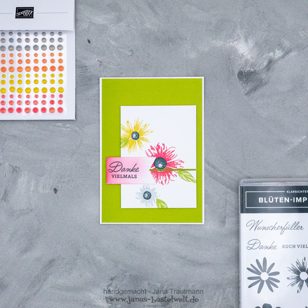 Wie du inzwischen sicherlich mitbekommen hast, war ich vergangenes Wochenende in Straßburg zur Stampin' Up!-Veranstaltung OnStage. Neben der Hauptveranstaltung konnte man noch ein reines Bastelevent "Kreativer Feierabend" dazubuchen und dafür zwischen zwei Produktpaketen aus dem nigelnagelneuen Jahreskatalog wählen. Ich hatte mich für "Blüten-Impressionen" entschieden, dazu gab es noch diversen Farbkarton (auch in den neuen InColor-Farben!), Schmucksteine und Zierelemente. In dem beiliegenden Heftchen finden sich zahlreiche Bastelideen für die beiden Produktpakete, die für das Event zur Verfügung standen und ich habe mich bei der ersten Karte des Abends sogar fast an die Vorgaben gehalten *lach*