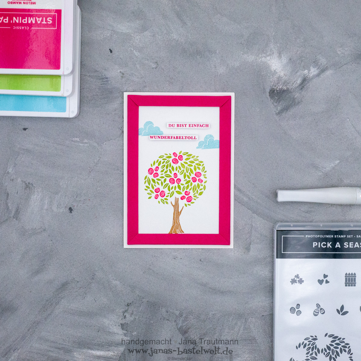 Für heute habe ich mir das nächste Stempelset aus der Sale-A-Bration vorgenommen - und zwar das Set "Pick A Season". Der Baum lässt sich durch Hinzufügen von Rosen, Herzen, Ostereiern etc. stets ein wenig anpassen, was ich total klasse finde.