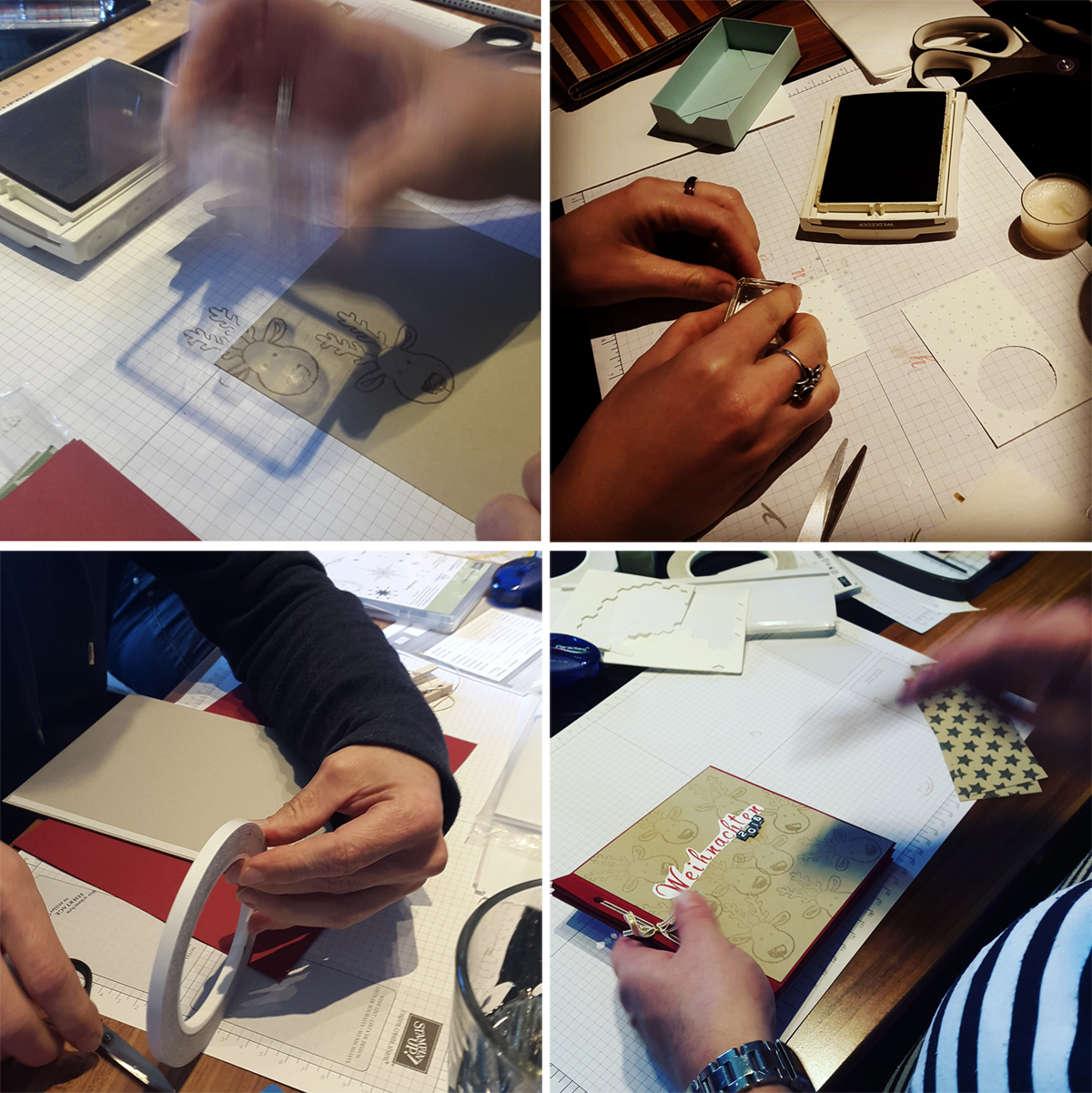 Als alle da waren und zunächst das organisatorische geklärt war (wie zum Beispiel die Bestellung beim Italiener zur Mittagszeit), ging es auch schon los mit Stempeln, Stanzen, Kleben und Schneiden. Toll finde ich immer wieder, wie sich die Workshop-Teilnehmer untereinander helfen und Rücksicht aufeinander nehmen. Zwischen all den Projekten - und manche davon waren schon eine kleine Herausforderung - konnte sich an der Candy-Bar gestärkt werden. Ein paar Eindrücke, die ich bereits auf Instagram gezeigt habe, habe ich hier zu einer Collage zusammengefasst: