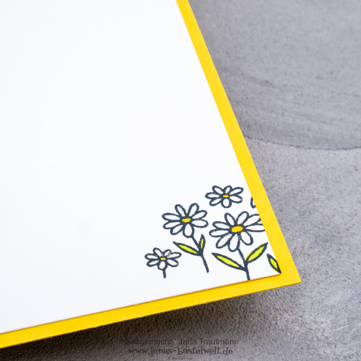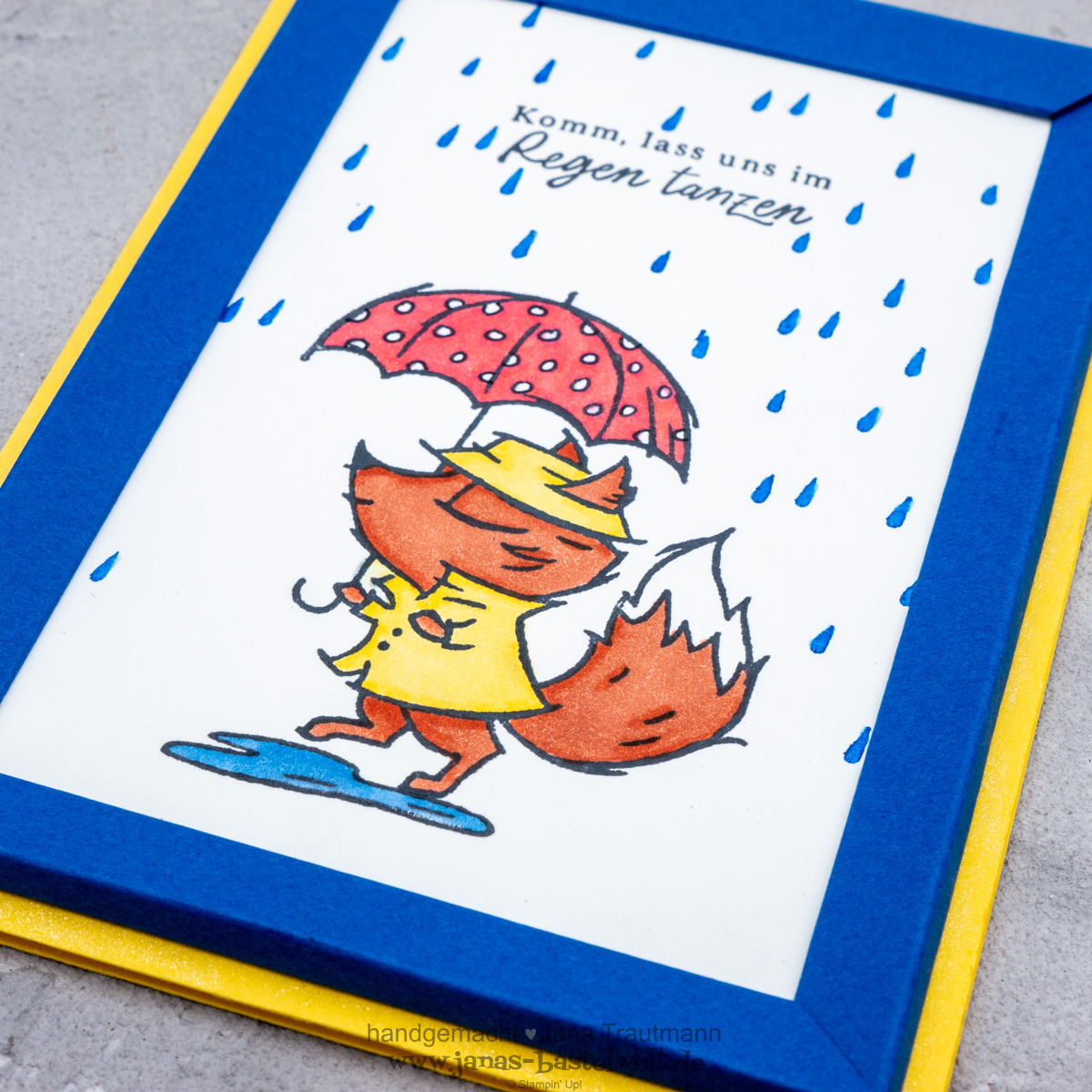 Ich habe mich bei dieser auf den ersten Blick eher schlichten Karte reichlich ausgetobt. Der Schirm hat eigentlich keine Punkte - diese habe ich mit dem Stampin' Write-Marker in Schwarz selbst hineingezeichnet. Zudem habe ich den Schirm mit dem Wink of Stella beschimmert - ebenso den Rand der gelben Grundkarte. Ein kleines Highlight sind die Pfütze und die Regentropfen, denen ich mit dem Präzisionskleber einen 3D-Effekt verliehen habe (all das kannst du im Video-Tutorial besser erkennen).