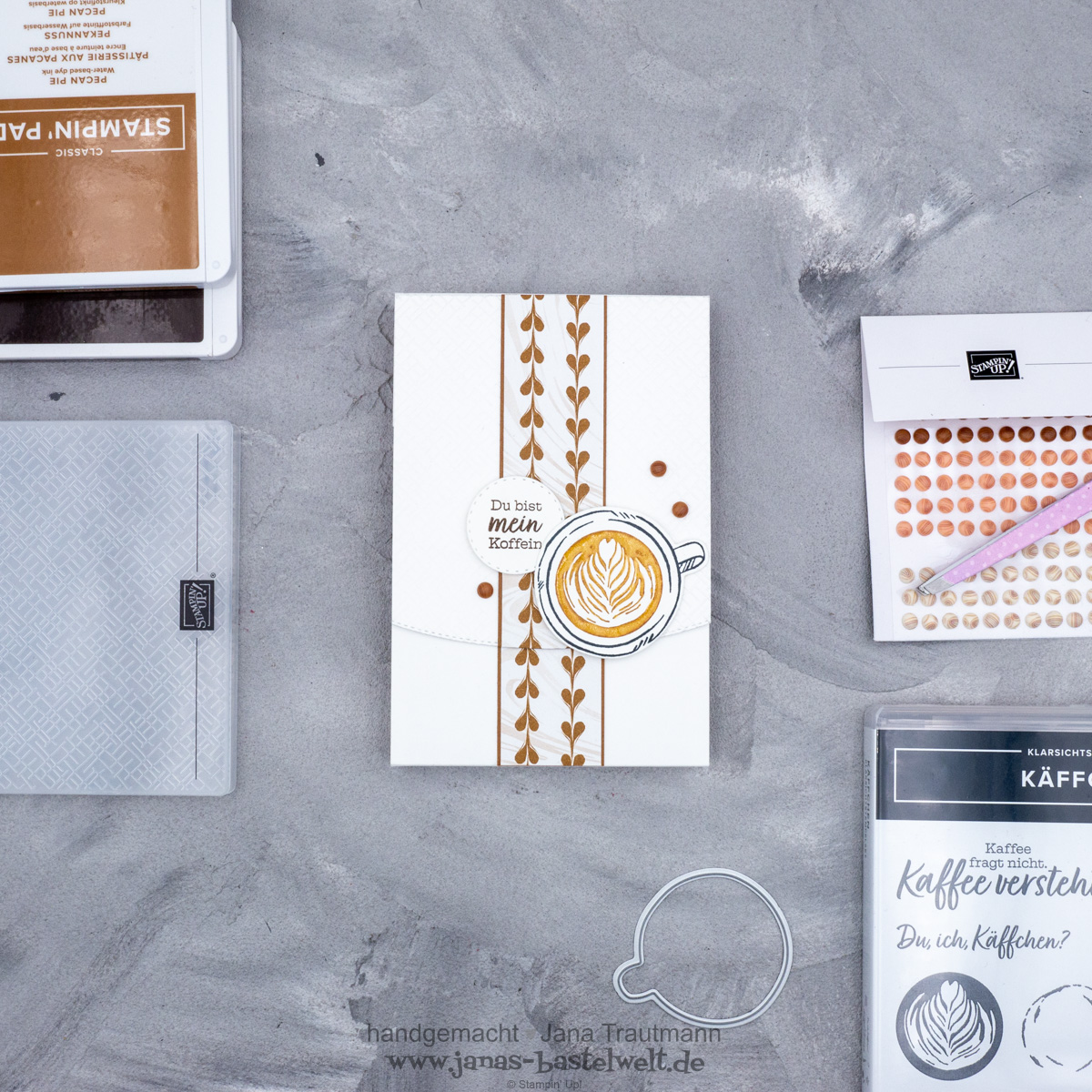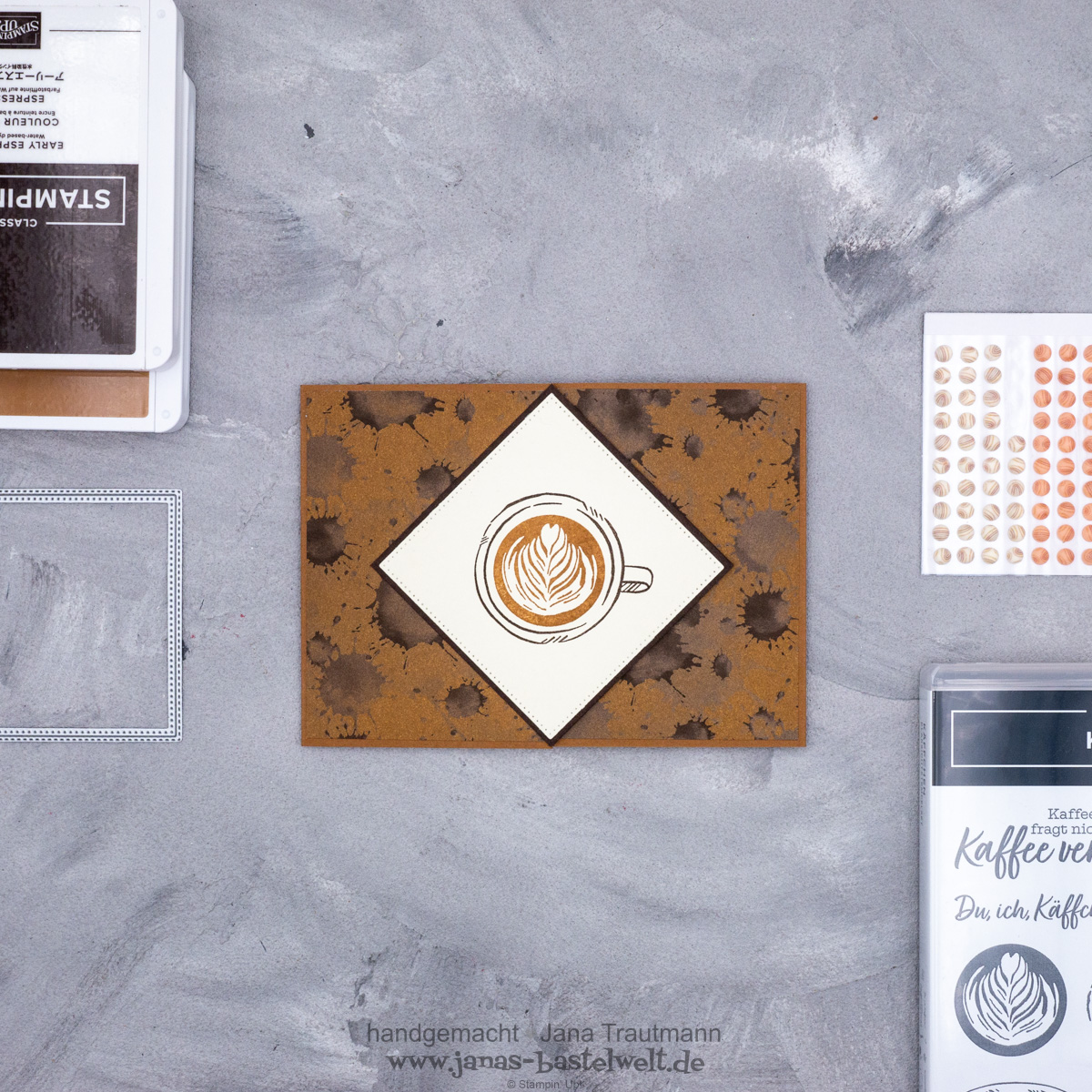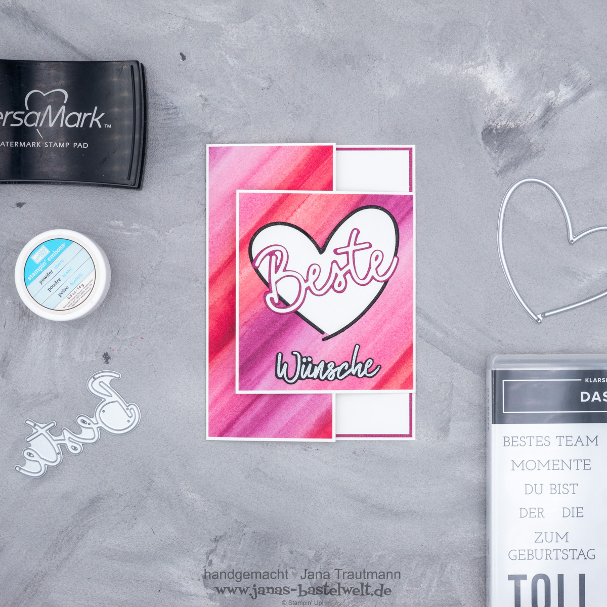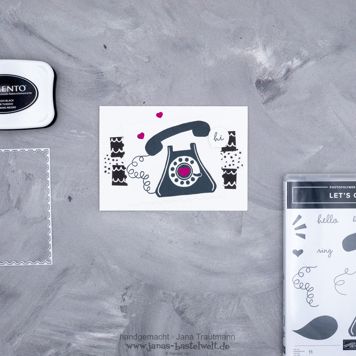 Es ist wieder Blog Hop-Zeit! Diesmal sollten aus den in der Grafik genannten sechs Materialien drei ausgewählt und damit etwas gestaltet werden, wie du vielleicht schon bei Eva gelesen hast. Ich habe folgende Karte gebastelt: