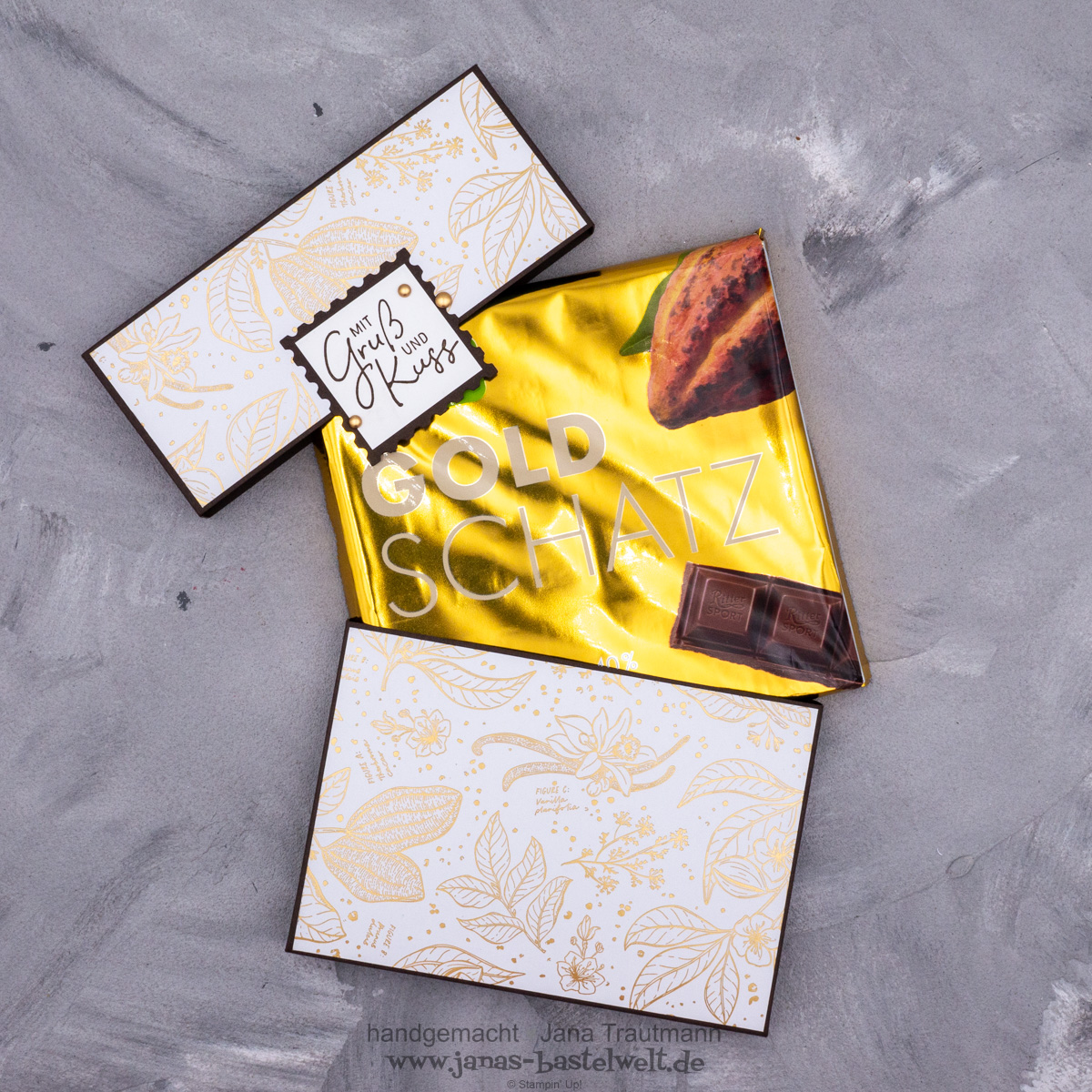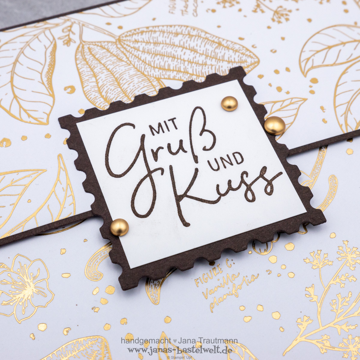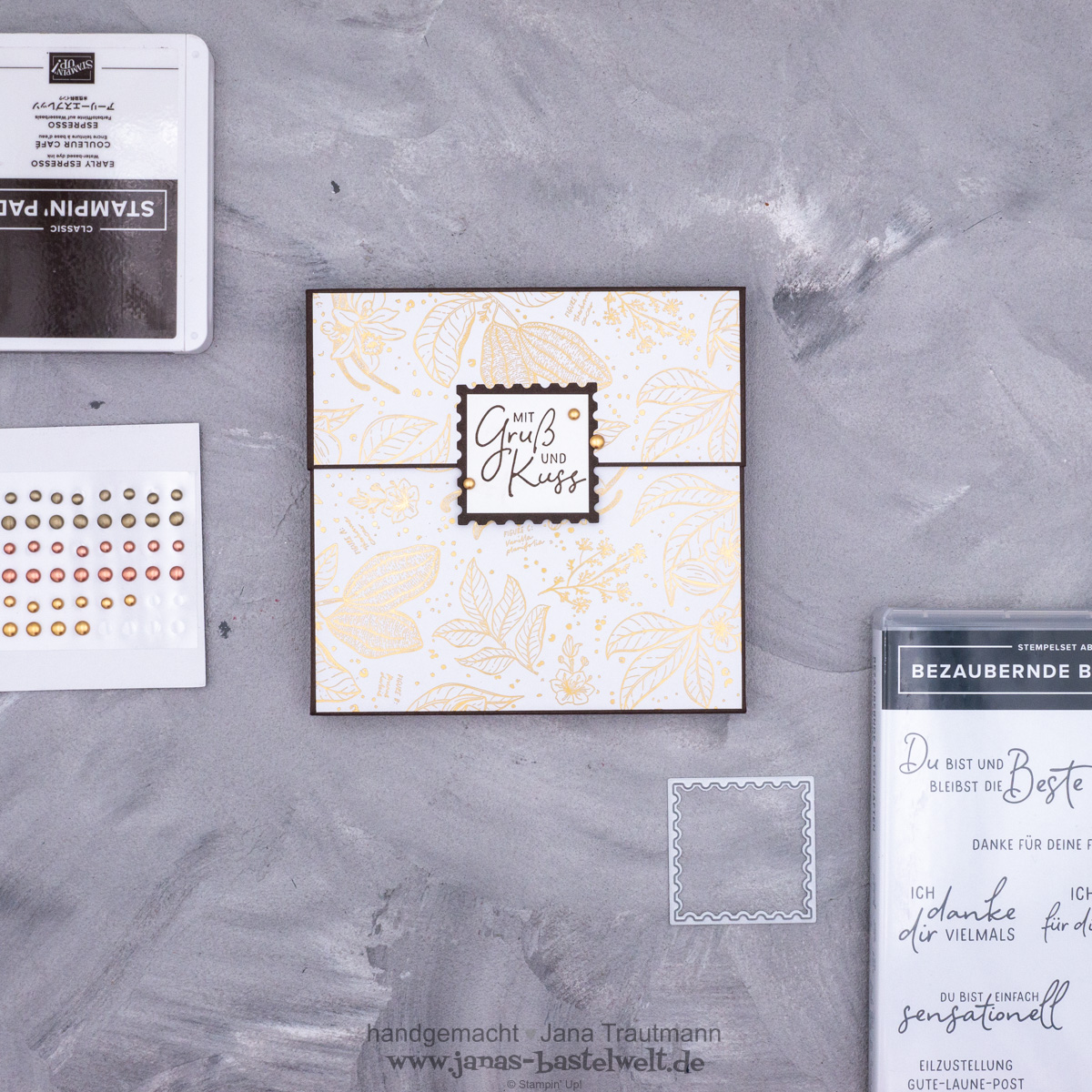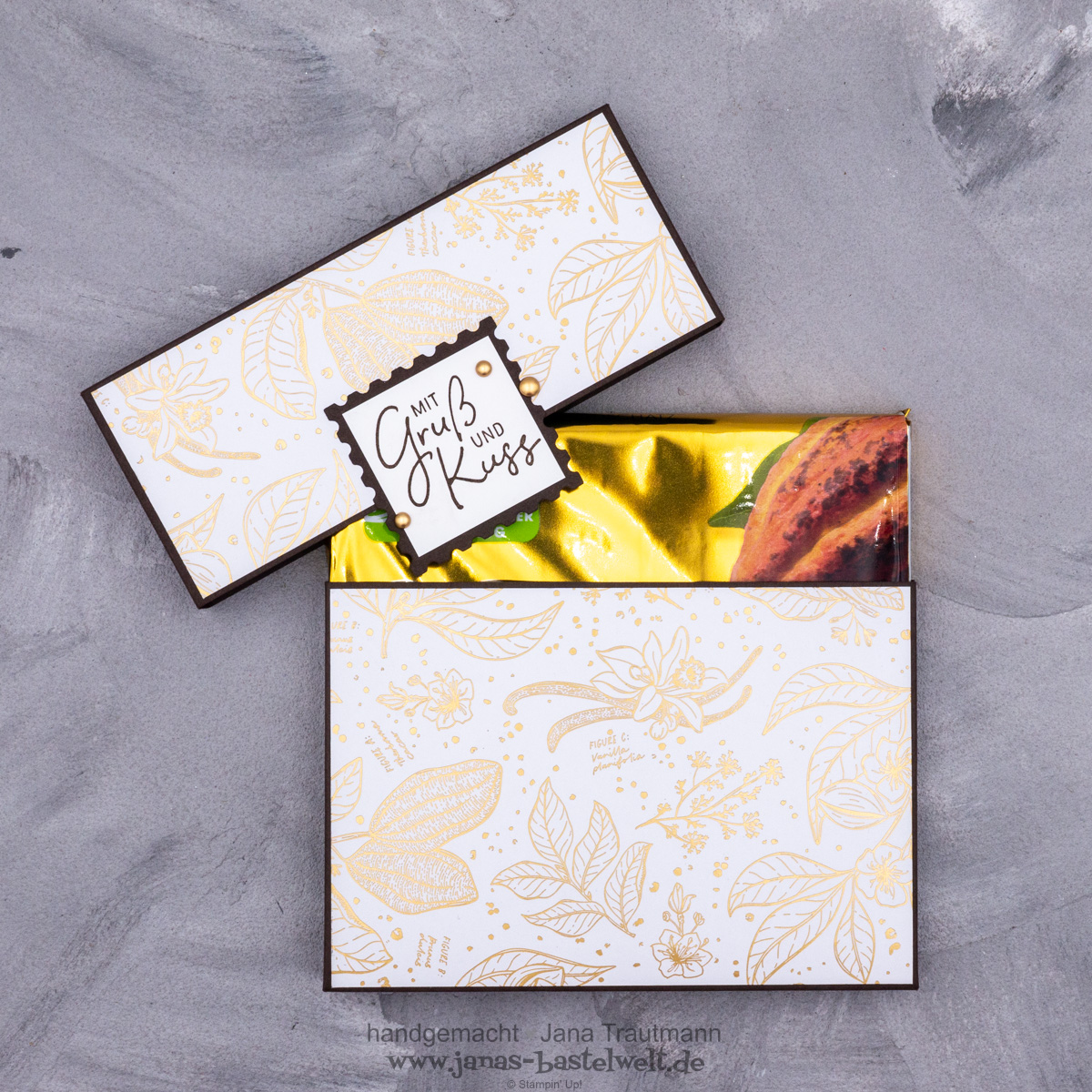 Der Perfektionist in mir freut sich natürlich ganz besonders, wie gut das Designerpapier zum Inhalt passt. Schau mal genau hin, dann entdeckst du auf beidem die Kakaobohne!