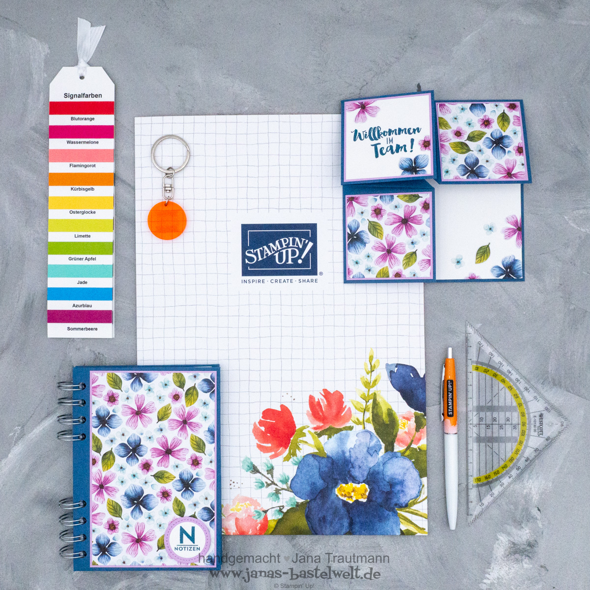 Die liebe Petra hat das aktuelle Einstiegsangebot genutzt und ist Teil meines wundervollen Stampin' Up!-Teams geworden. Ich freue mich immer sehr, mein Team wachsen zu sehen und möchte daher all meinen neuen Teammitgliedern den Einstieg so einfach und herzlich wie möglich gestalten. Neben zahlreichen wichtigen Infos per eMail verschicke ich daher stets ein kleines Begrüßungspaket, das weiterführende Informationen, das wichtigste Bastel-Tool überhaupt (Geodreieck!), einen von mir angefertigten Farbfächer und vieles mehr enthält. Dazu gibt es eine von mir gestaltete Karte mit dazu passendem Notizbuch. Insbesondere letzteres möchte ich dir heute im Detail zeigen - doch zunächst eine kleine Übersicht: