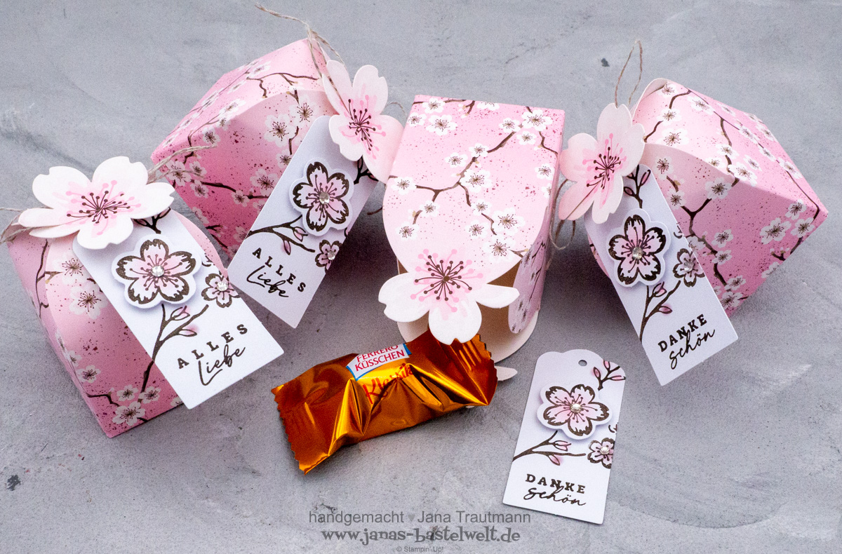 Hast du schon das Kreativset "Kirschblüten-Schachteln" entdeckt (klick)? Ich habe mir dieses bereits im Dezember direkt gekauft und kürzlich alle zwölf Schachteln aus dem Set umgesetzt, um diese als kleines Dankschön den Teilnehmern an meiner letzten Sammelbestellung mit ins Paket zu legen.