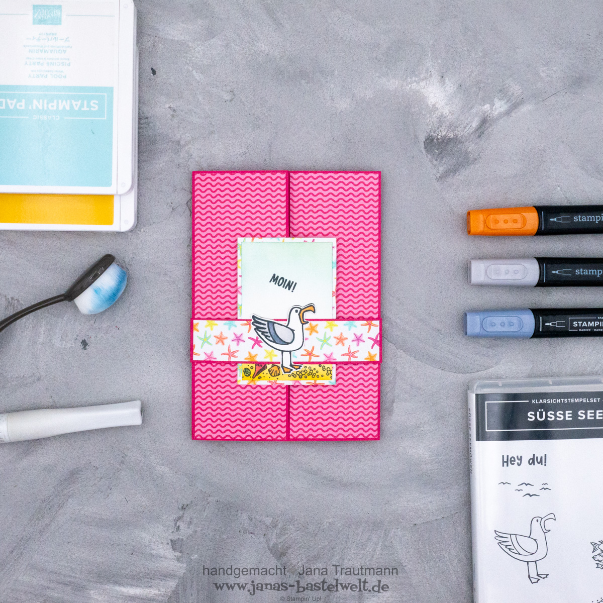 Einmal monatlich treffe ich mich online mit meinem Team, damit wir uns austauschen können. Meist basteln wir zusammen auch eine Kleinigkeit und dafür habe ich mir diesmal eine Karte mit dem genialen Seemöwen-Stempelset aus der aktuellen Sale-A-Bration einfallen lassen.